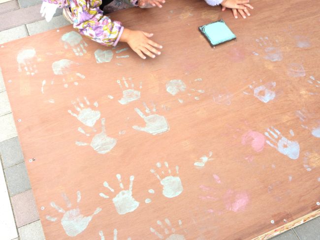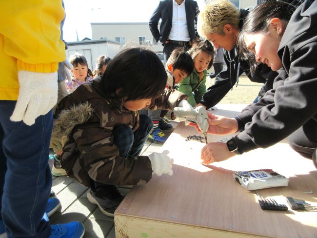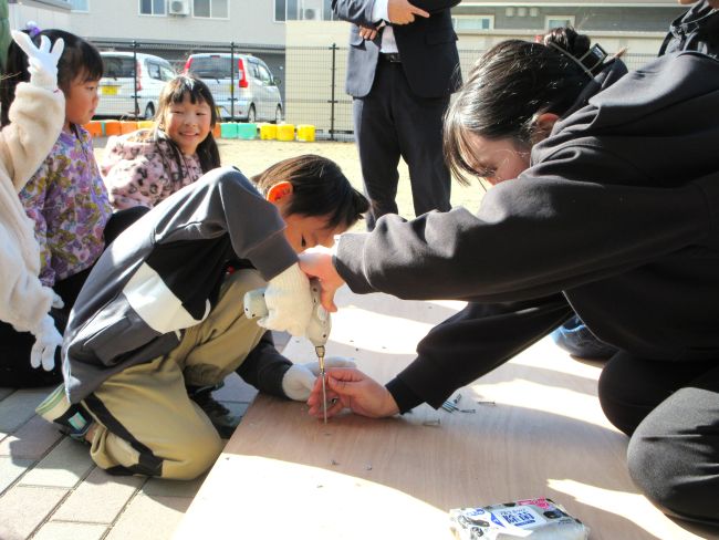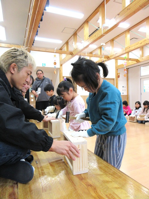 【令和7年11月13日】木工教室(DIY体験) 2025.11 HOUSE ENの工務店の方をお招きし、園で「木工教室(DIY体験)」を実施しました。子どもたちは木の板を組み合わせた箱にトンカチを使っての釘打ちを行いました。また、電動ドライバーを使った作業にも挑戦しました。最後はインクを使って板に手形をぺったんと押したりしました。活動中は「もっとやりたい!」「大きくなったら大工さんになる!」という声も聞かれるほど夢中で取り組む姿が見られました。木の感触や工具の使い方を知り、ものづくりの楽しさを存分に感じることができた一日となりました。